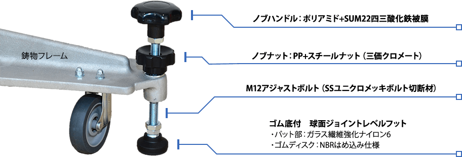 キャスターとノブハンドル仕様アジャスターで設置⇔移動がスピーディーアンカー固定不用の用途専用架台
